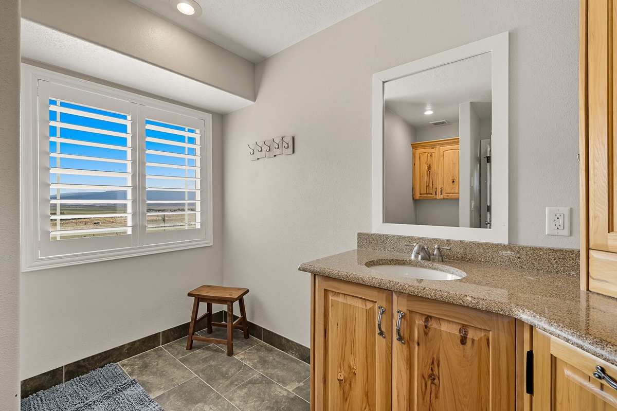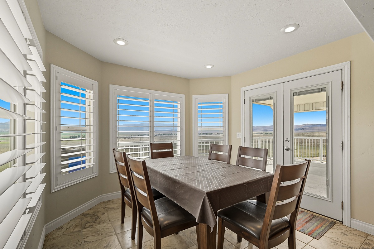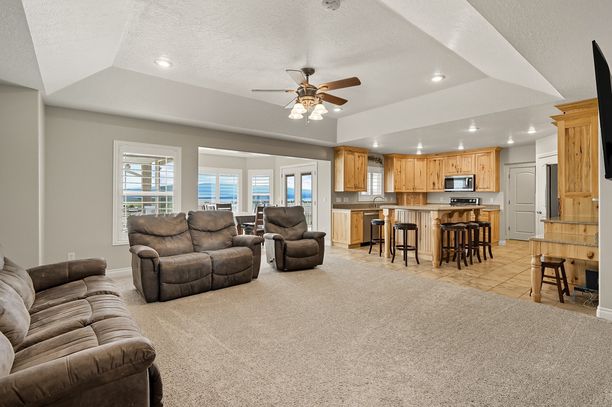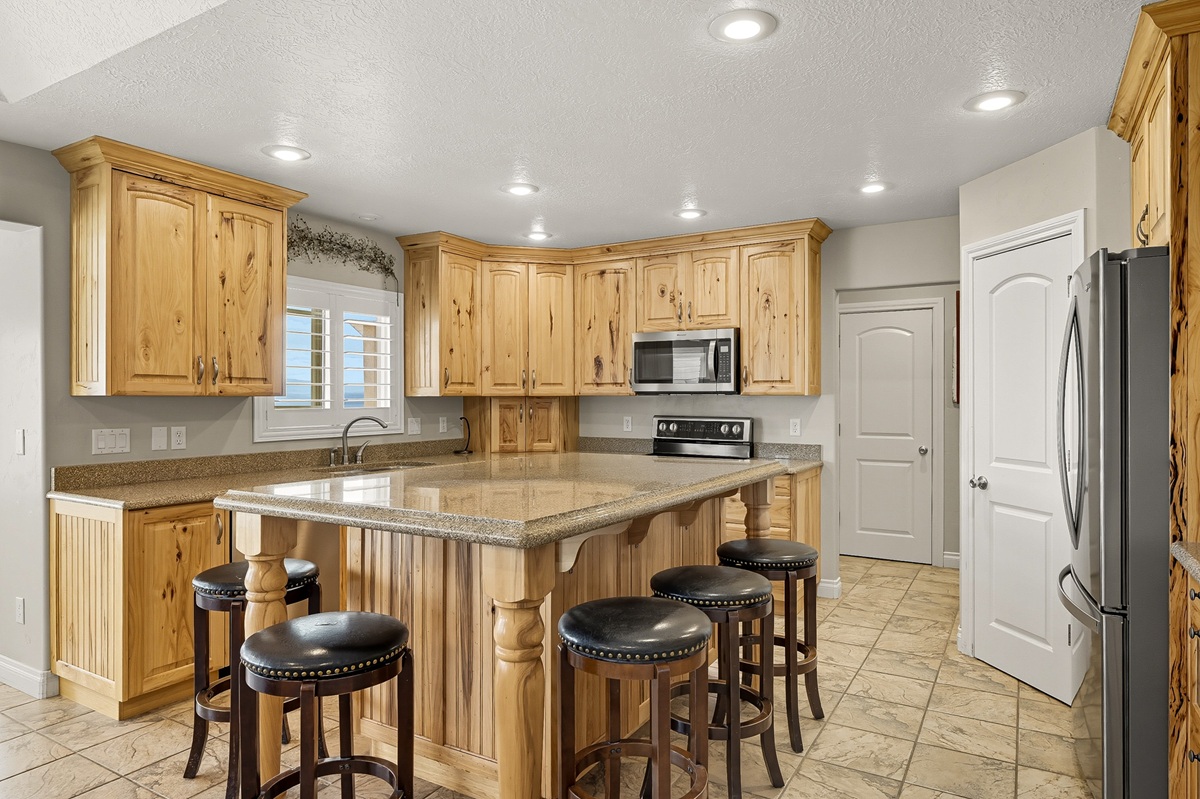 With an open-concept layout, the rooms are generously sized with smart separation of living and sleeping areas. The kitchen, dining, and living spaces flow seamlessly together, creating a warm and inviting atmosphere. Well-designed with plentiful cabinet and counter space, the kitchen has sleek granite countertops, a large island, and a double oven. The dining area is surrounded by windows framing the beautiful views of the valley with direct access to the deck.