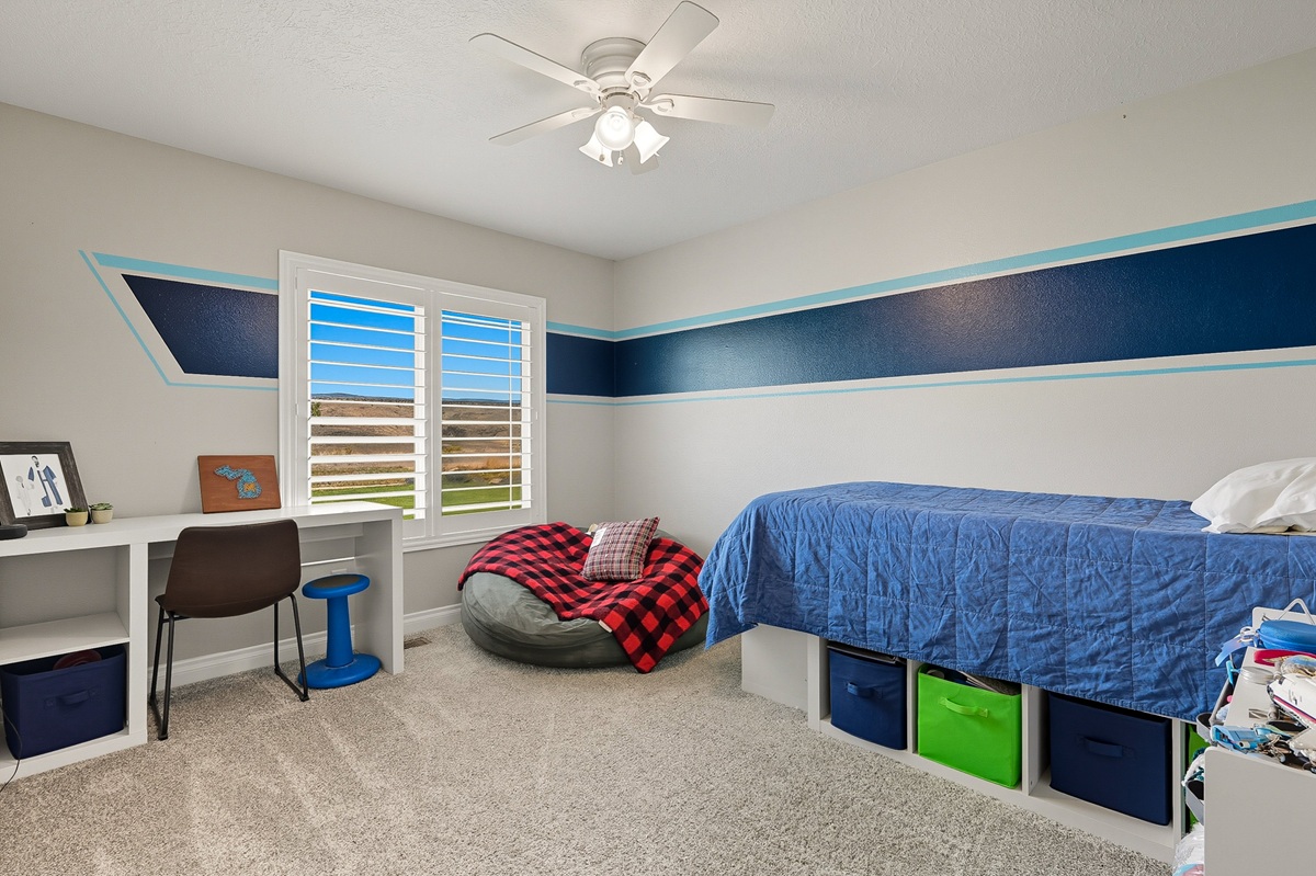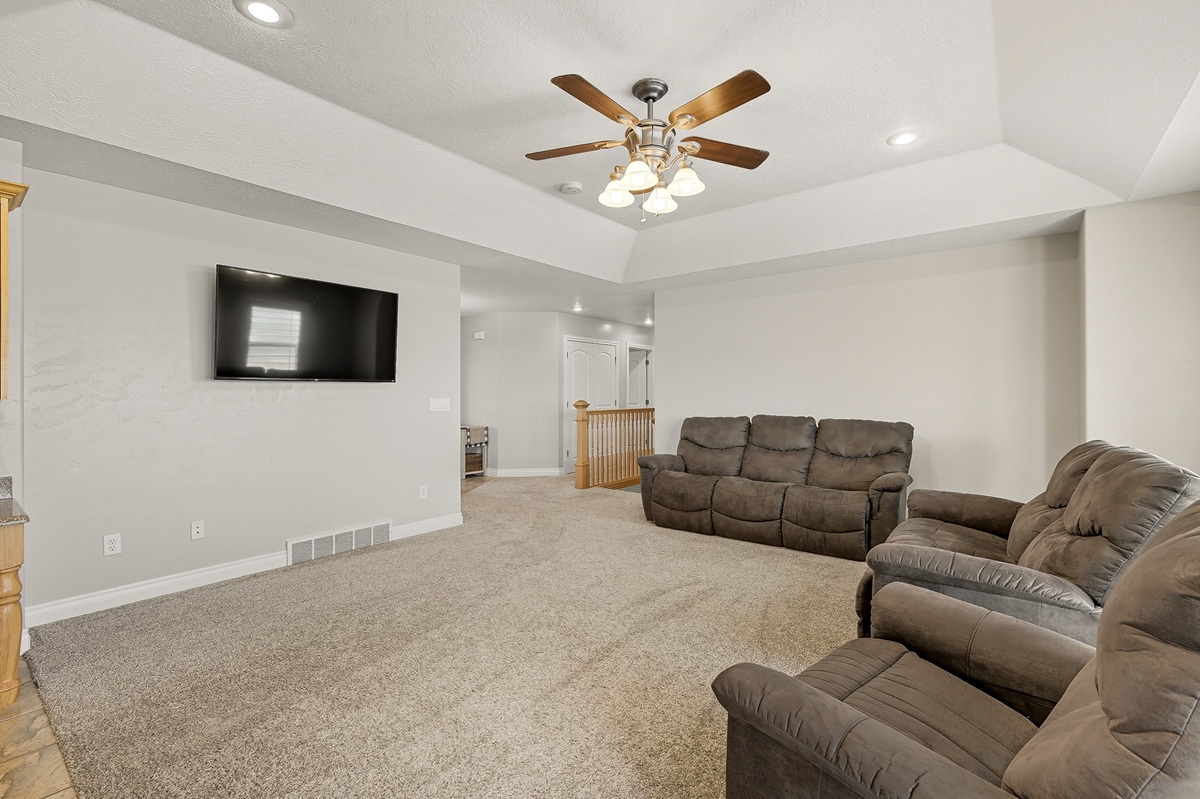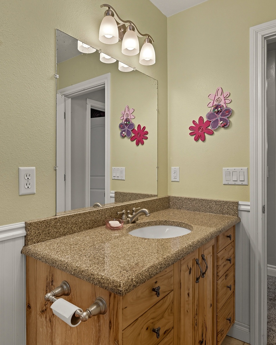 With an open-concept layout, the rooms are generously sized with smart separation of living and sleeping areas. The kitchen, dining, and living spaces flow seamlessly together, creating a warm and inviting atmosphere. Well-designed with plentiful cabinet and counter space, the kitchen has sleek granite countertops, a large island, and a double oven. The dining area is surrounded by windows framing the beautiful views of the valley with direct access to the deck.