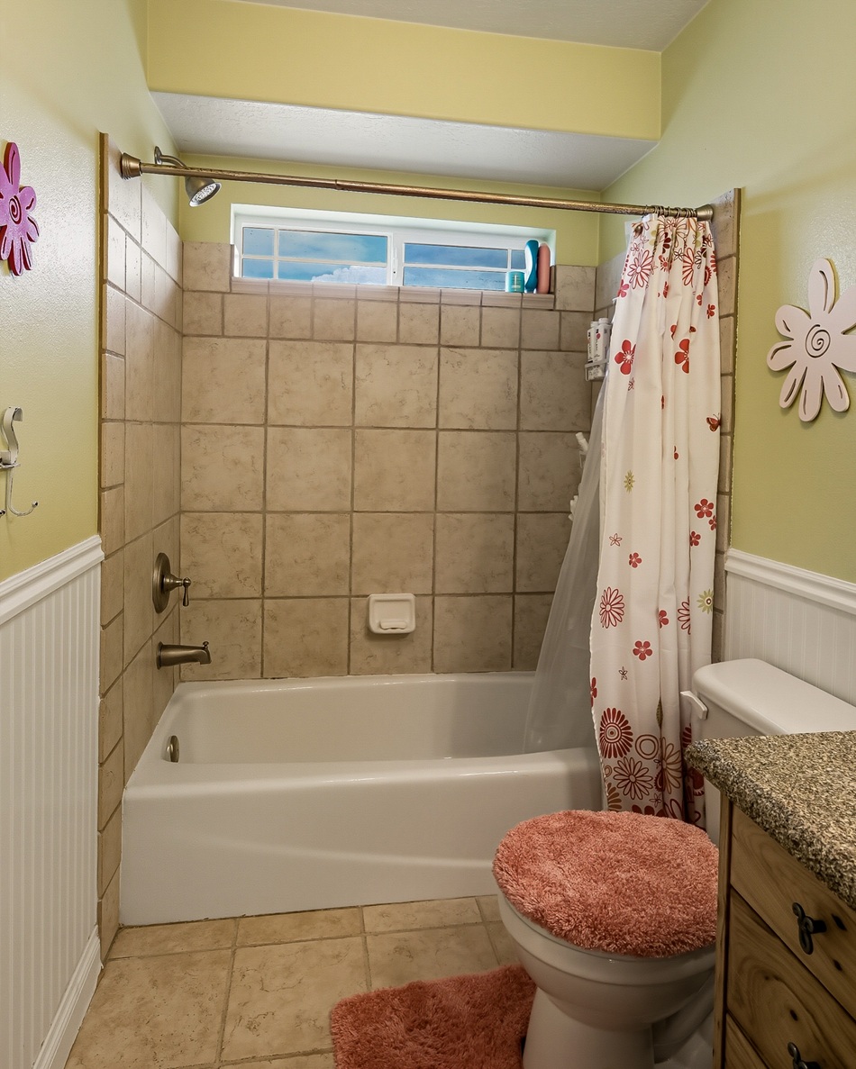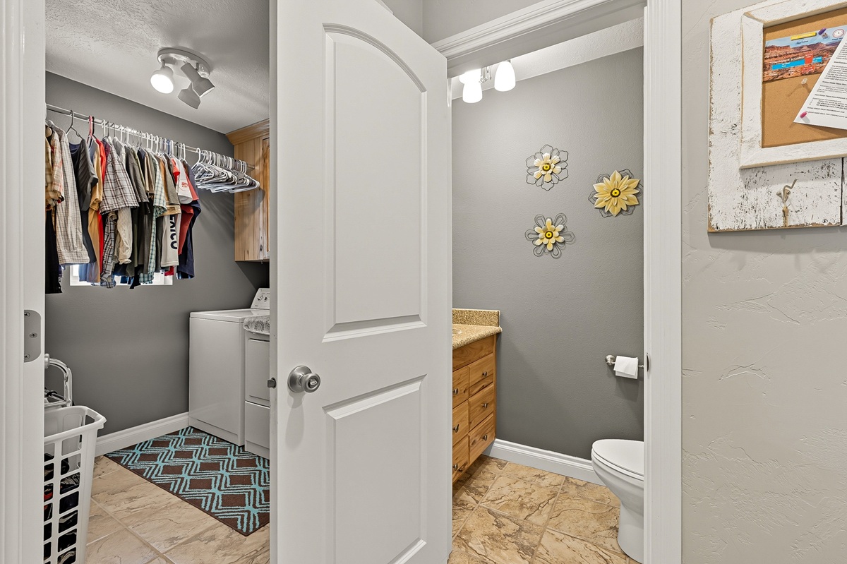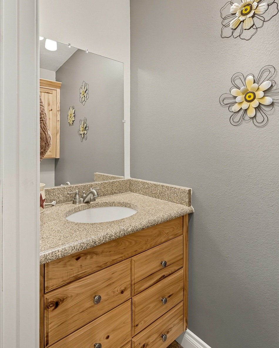 A spacious master bedroom connects to a well-appointed bathroom featuring a walk-in cultured marble shower and abundant built-in cabinetry. The main level also includes two additional bedrooms and a full bathroom, along with a laundry room and a half bath conveniently located near the entrance to the 3-car garage.