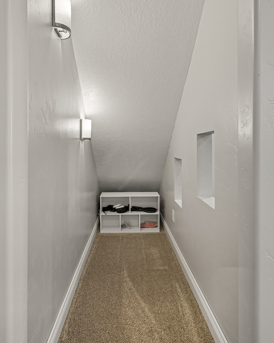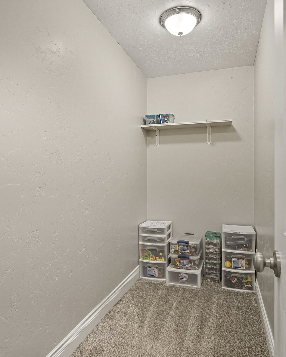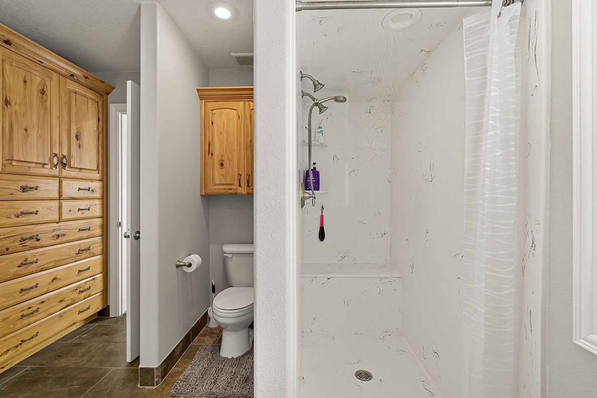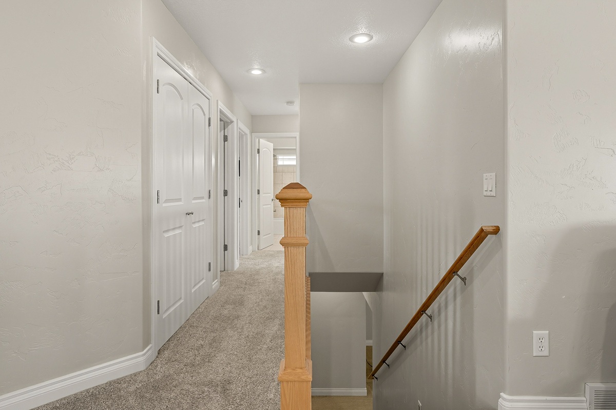 A spacious master bedroom connects to a well-appointed bathroom featuring a walk-in cultured marble shower and abundant built-in cabinetry. The main level also includes two additional bedrooms and a full bathroom, along with a laundry room and a half bath conveniently located near the entrance to the 3-car garage.