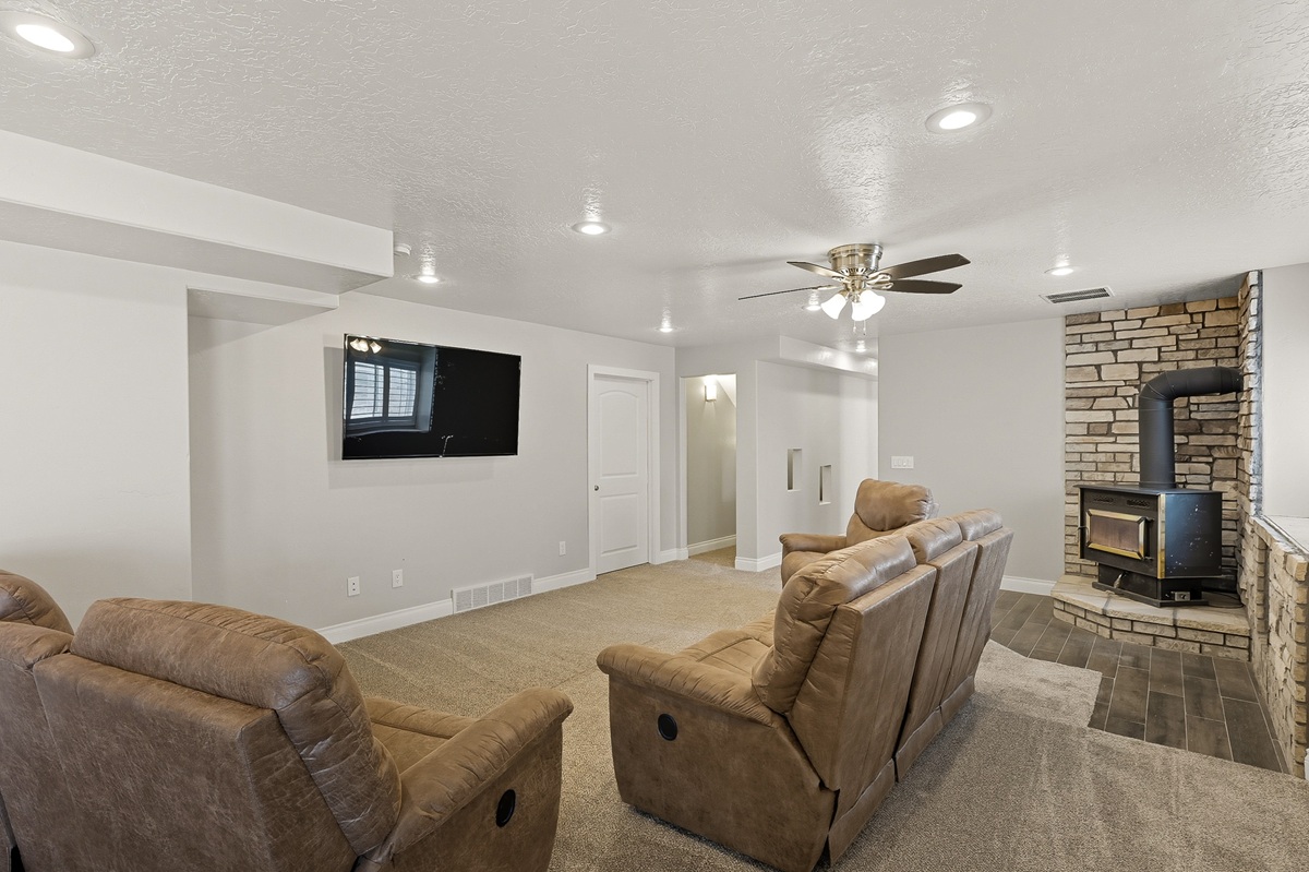 Full of natural light with full-size windows, the lower level includes two comfortable bedrooms, an exercise room, office nook and cozy family room with a wood burning stove. Its own private entrance is an asset.