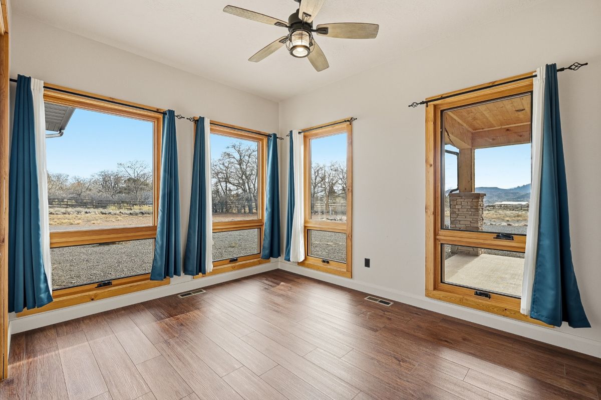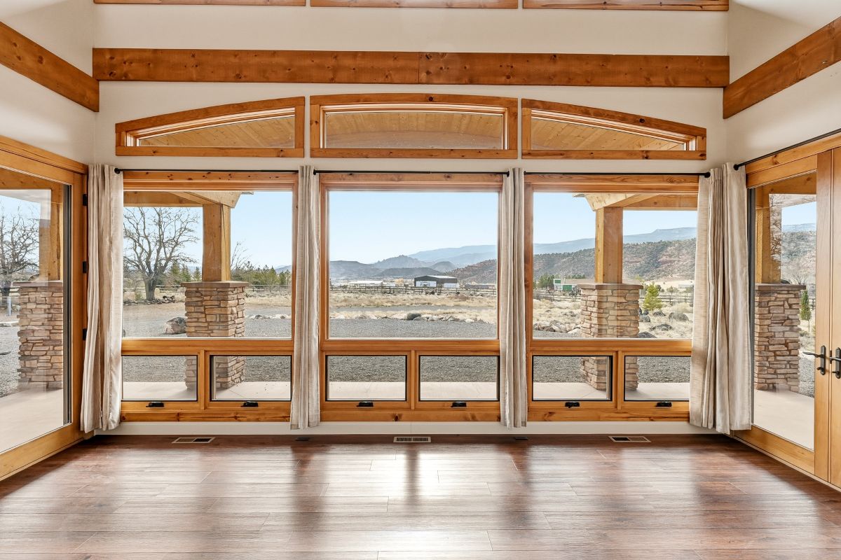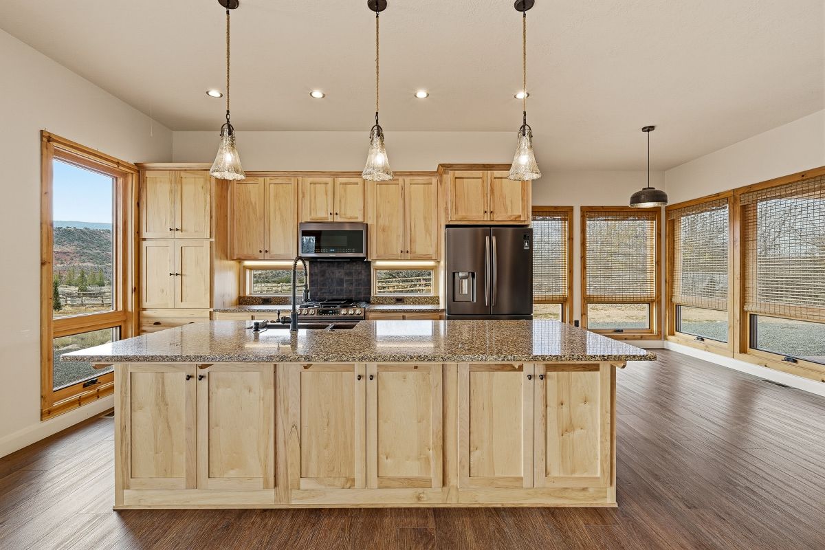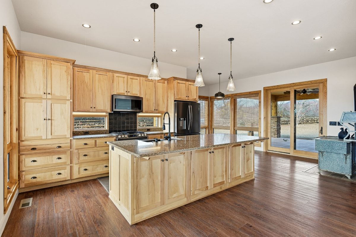 An impressive entrance with a huge, covered front porch leads to an open, window-filled great room. Off to the side is the sizable kitchen with a plentiful amount of custom-made rustic maple cabinets and granite countertops. An island adds to the workspace. Adjoining the kitchen is a spacious butler’s pantry. A separate dining area with generous windows opens to a significantly sized covered patio that is a wonderful outdoor living space. The master bedroom with two walls of windows bringing in the red rock view, has access to the same patio. The master bath and walk in closet are nicely arranged and convenient. Two smaller guest rooms and a guest bath are on the opposite side of the house. In the middle is the laundry room that has a door to the back yard and a door to the extra-sized garage.