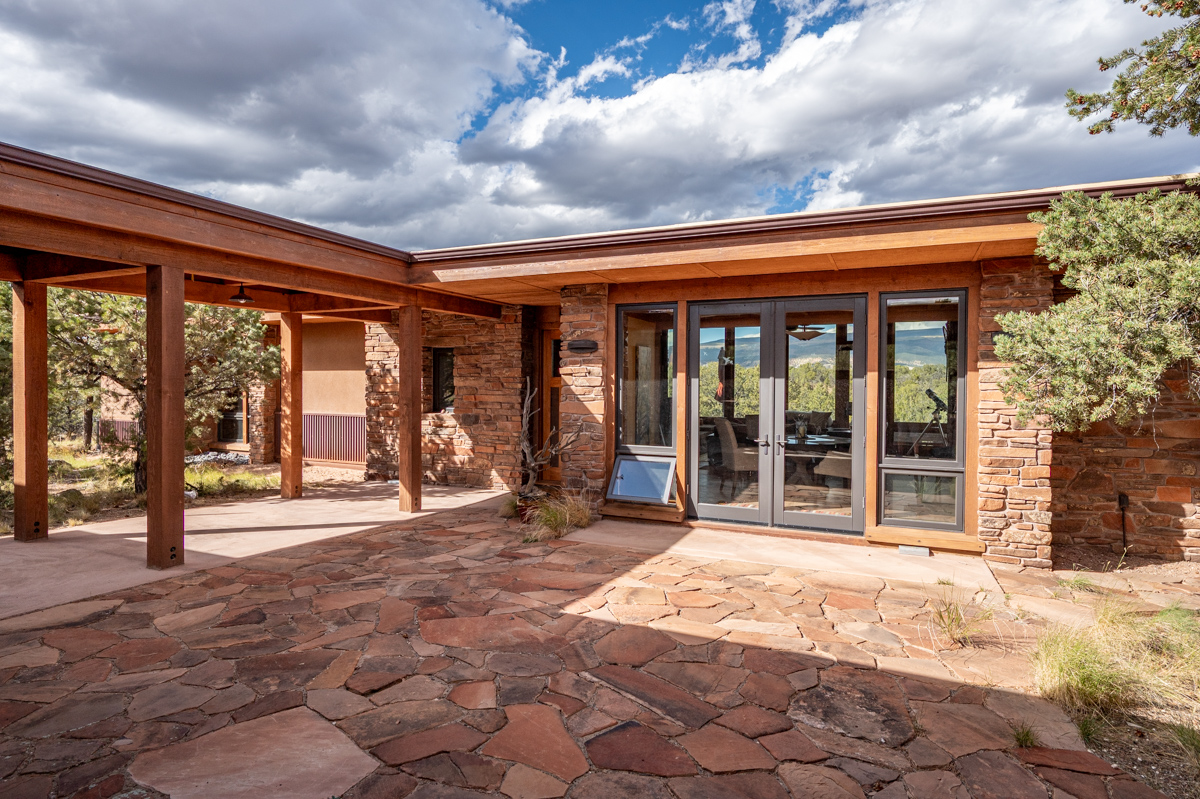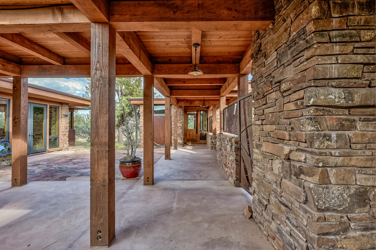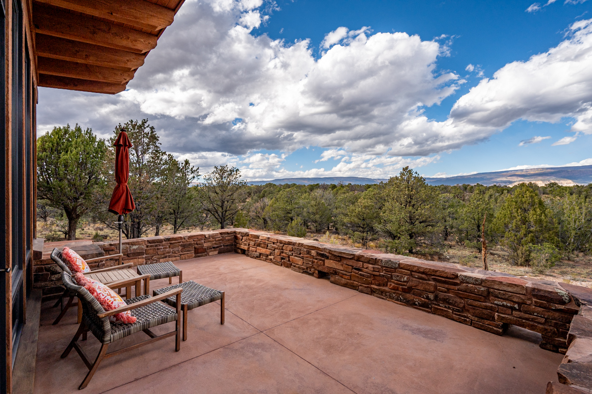 Privacy is a key element of life on the Mesa. This lot has an entire 45 acres, guaranteeing a sense of wilderness and solitude. All the homes on the Mesa cannot be seen from one another or the roads. The driveway for this home winds around tall pinion and juniper, leading to the intriguing entrance to the buildings. There are three separate structures joined by covered walkways. The garage is in the front, shielding the home while the guest home is on the other side. The home is toward the rear and accessed by a circular drive. The patios and walkways are all convenient and inviting, as well as contributing to a very pleasant outdoors. There is an appealing wholeness and unity to the entire property. In addition, there is the benefit of the incredible night skies to give an appreciation of our planet and universe.