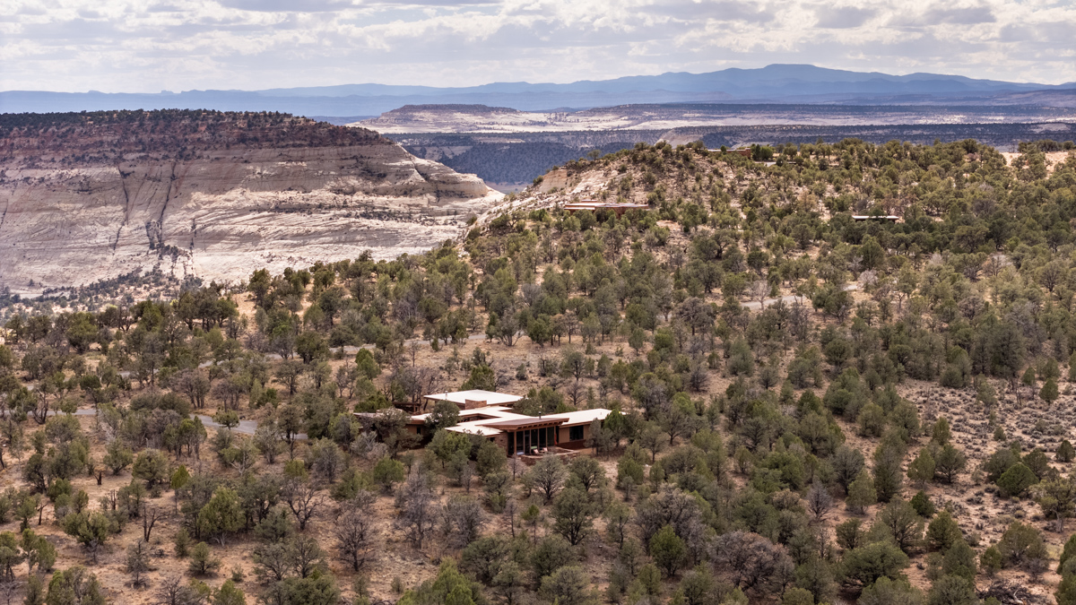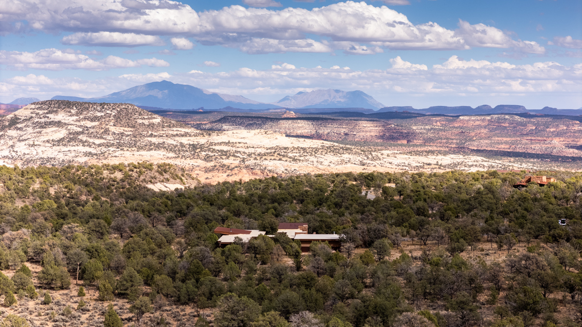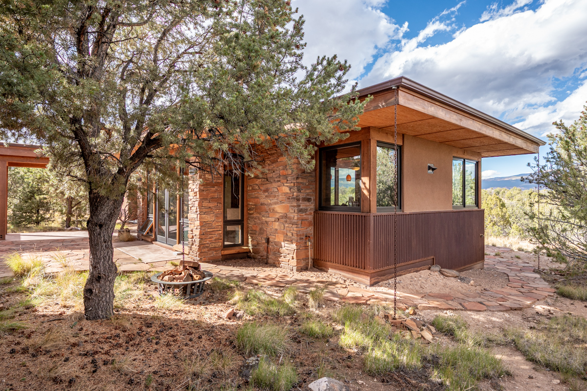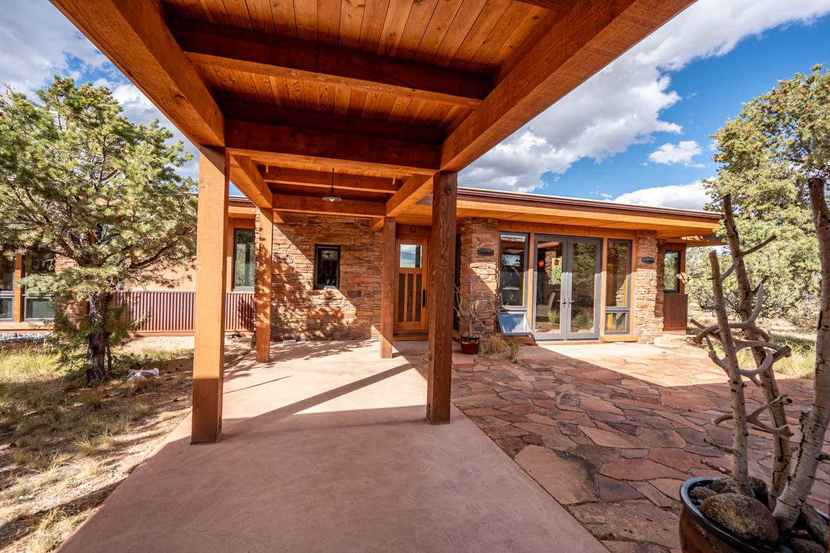 Privacy is a key element of life on the Mesa. This lot has an entire 45 acres, guaranteeing a sense of wilderness and solitude. All the homes on the Mesa cannot be seen from one another or the roads. The driveway for this home winds around tall pinion and juniper, leading to the intriguing entrance to the buildings. There are three separate structures joined by covered walkways. The garage is in the front, shielding the home while the guest home is on the other side. The home is toward the rear and accessed by a circular drive. The patios and walkways are all convenient and inviting, as well as contributing to a very pleasant outdoors. There is an appealing wholeness and unity to the entire property. In addition, there is the benefit of the incredible night skies to give an appreciation of our planet and universe.