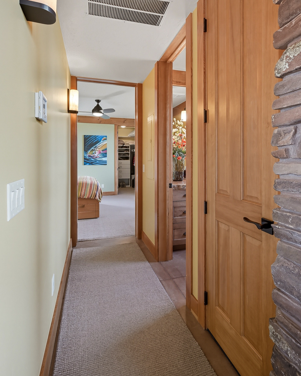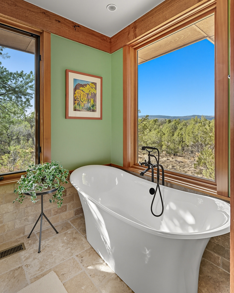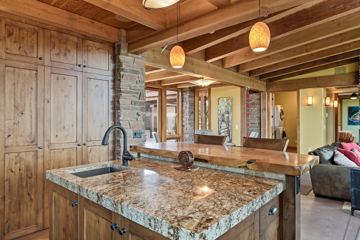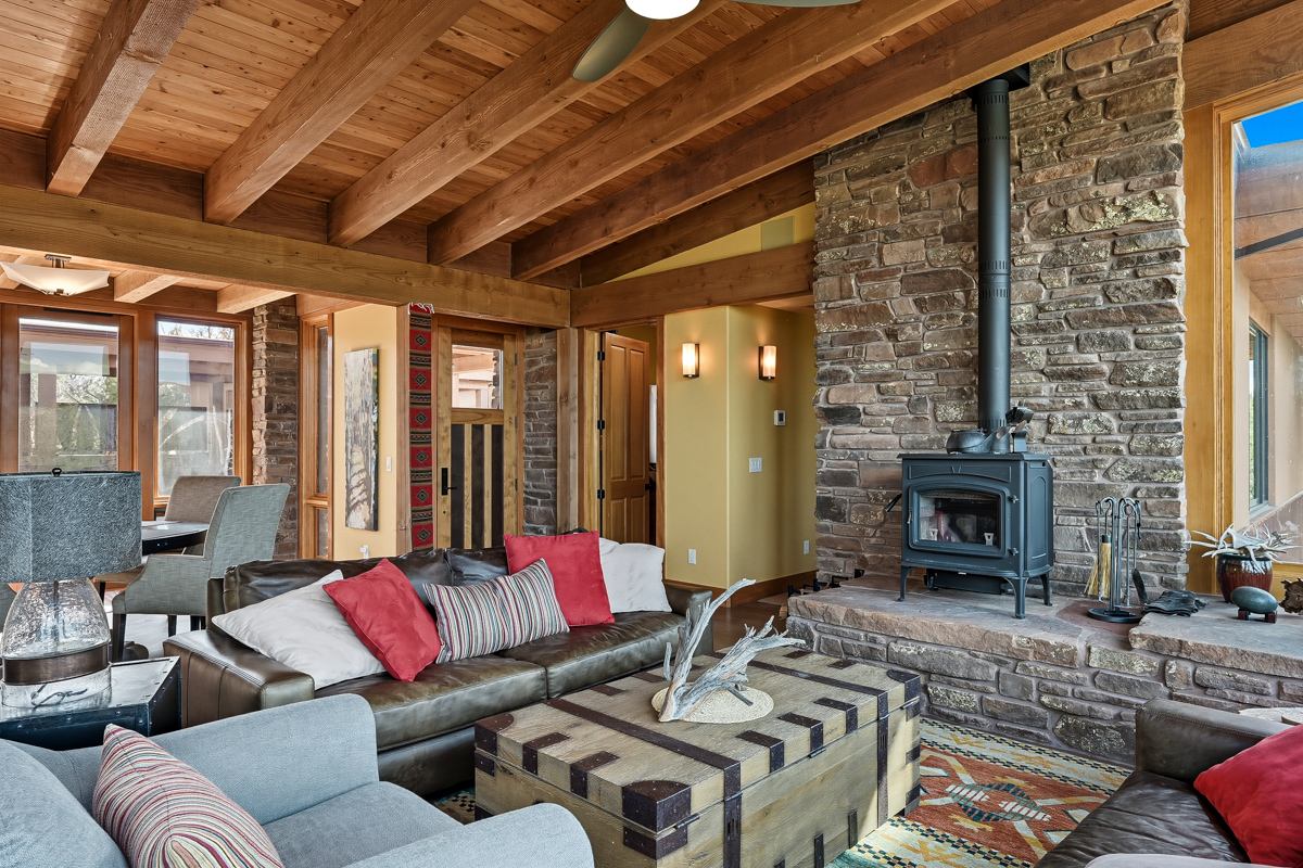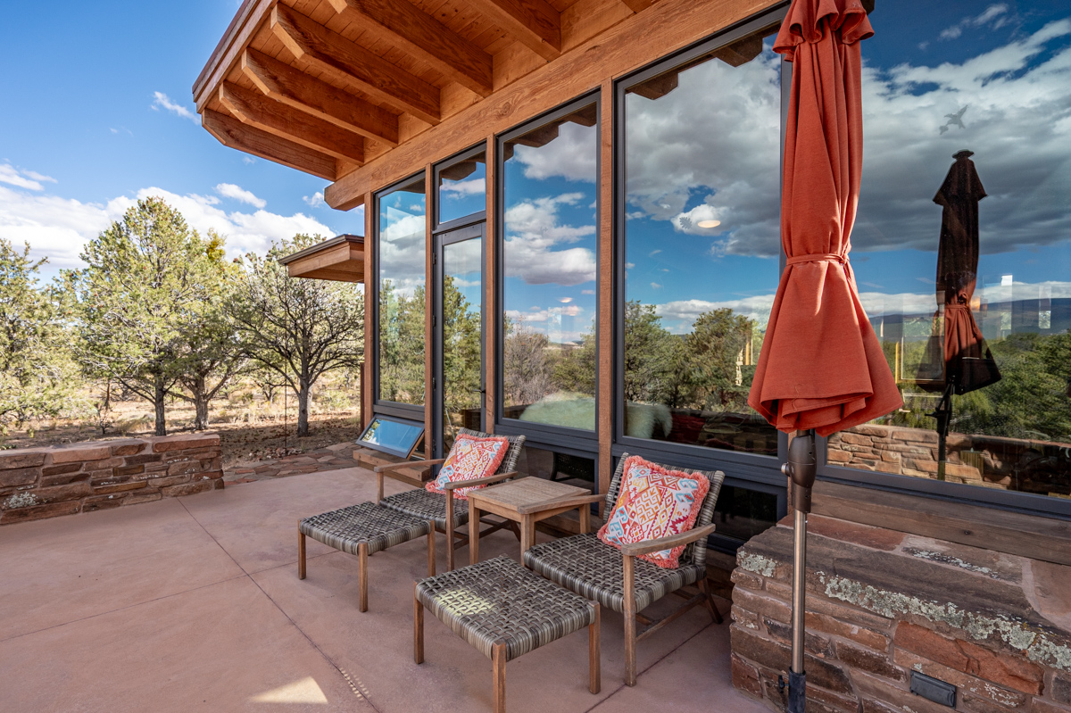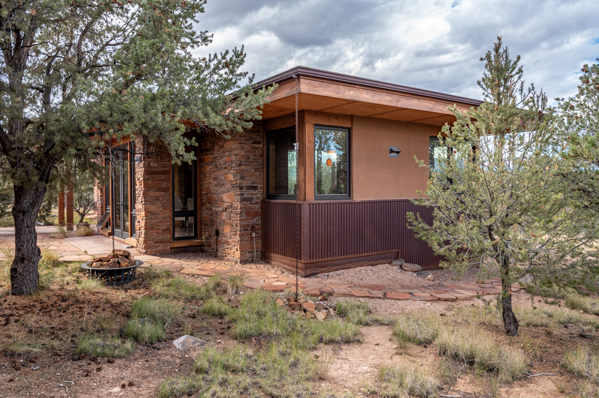 The home is an intimate, window-filled space with a comfortable great room, quality kitchen, guest bath, and master bedroom with an adjoining long vanity, leading to a tub and luxurious steam shower. It is a welcome place to return to after a day of hiking and exploring and represents a restorative refuge, both calming and invigorating. The plentiful, high-end windows serve to bring the outdoors inside, so that the transition between the two is less apparent.